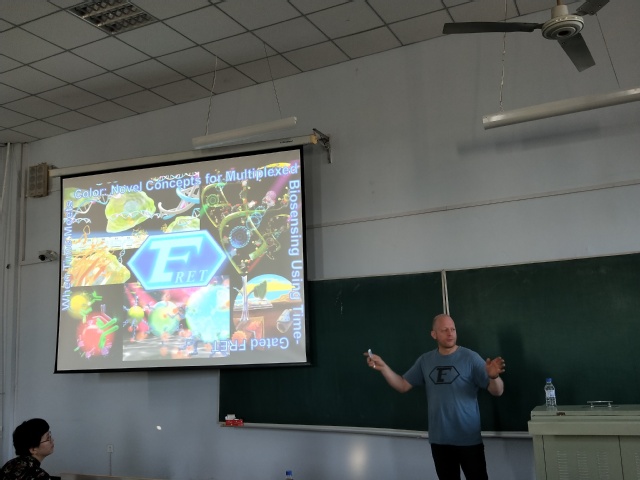 报告开始后,Hildebrandt教授首先向大家介绍了巴黎第十一大学的主要概况和科研师资力量等情况。其次,详细介绍了他的课题研究内容,包括时间分辨和时间门控FRET,镧系元素/染料/量子点之间的FRET用于光谱和时间多路发光检测的特定优势,及其在不同均相单步FRET生物传感器中的最新应用:灵敏和特异性检测来自低体积液体样品、细胞膜或细胞内部的多种生物标记物。