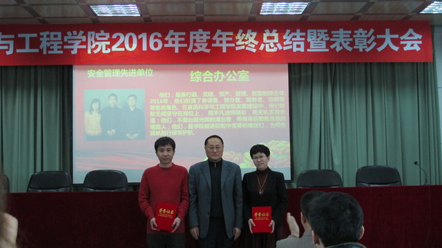 颁奖仪式首次以颁奖词和PPT的方式对先进典型事迹进行了展播。学院领导先后为2016年度先进单位和安全管理先进单位,教书育人特别奖,教书育人先进个人,科研工作先进个人,管理服务育人先进个人,优秀学生和先进班级进行颁奖,并合影留念。