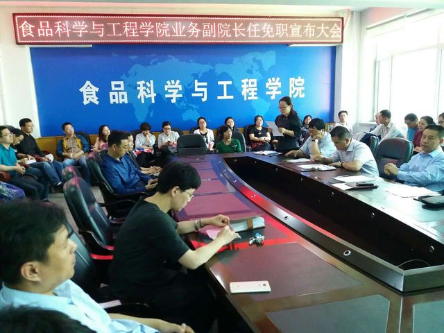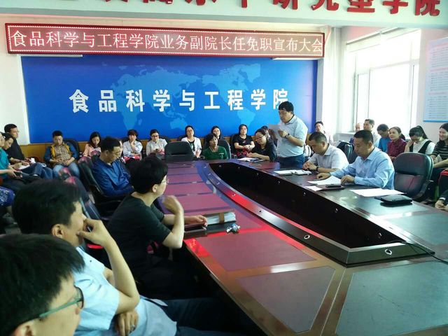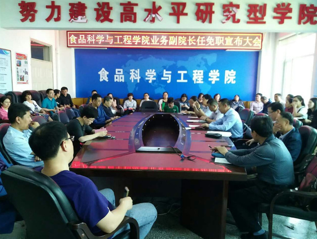 2017年6月5日,beat365中国唯一官网在食品楼三楼会议室召开业务副院长任免职宣布大会。学院前任、现任领导班子,全体教职工参加了会议。会议由学院党委书记高福和同志主持。
