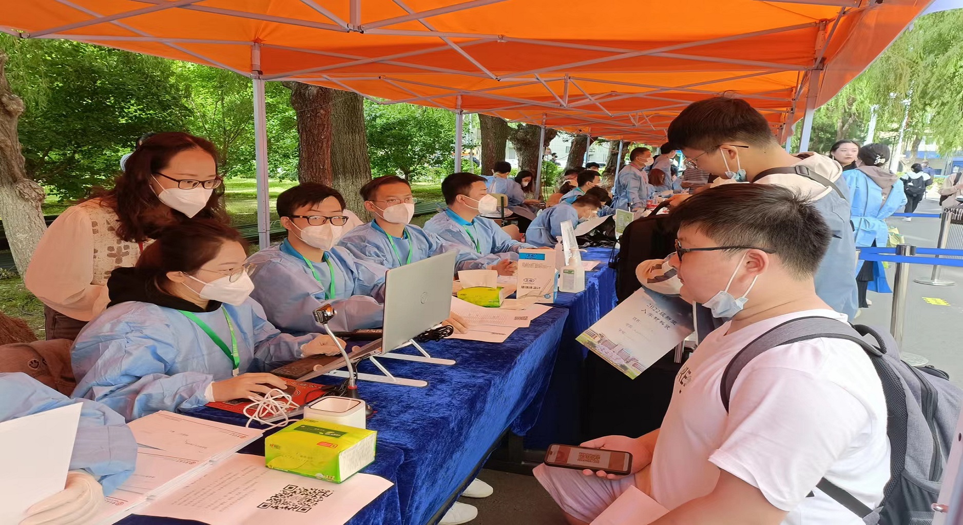 8月24日早七点,迎新工作者们准时到达设立于学生第五公寓前的临时接待站,穿好防护服,戴好N95口罩,开始了忙碌的迎新工作:测温、发放抗疫物资、收集材料,耐心回答新生们的各种问题,为新生们指引宿舍楼的方向。此刻的长春艳阳高照,工作者们防护服内汗流浃背,但耐心依旧,认真负责,帮新生搬运行李、在报到处与宿舍间不断往返以确保迎新生工作的顺利进行。