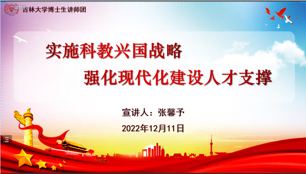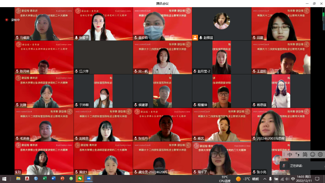 为深入学习宣传贯彻党的二十大精神,教育引导广大青年学子坚定不移听党话、跟党走,推动党的二十大精神入脑入心,见行见效,培养新时代学子自信自强、守正创新,踔厉奋发、勇毅前行的精神,2022年12月11日,吉林大学博士生讲师团讲师张馨予走进beat365中国唯一官网开展了“新征程,青年讲”党的二十大精神宣讲活动。beat365中国唯一官网全体研究生党员、预备党员、研究生会成员、助管及研究生代表等100余人参与了本次活动。