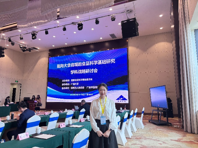 近日,国家自然科学基金委“面向大食物观的食品科学基础研究学科战略研讨会”在广西钦州召开。本次研讨会由国家自然科学基金委生命科学部、广西壮族自治区钦州市人民政府、广西大学和广西中医药大学联合主办,江南大学陈卫院士、南京师范大学黄和院士、南开大学王硕教授共同担任研讨会主席。我院2023级食品科学与工程专业博士研究生闫昭卉作为国家自然科学基金青年学生基础研究项目(博士研究生)负责人代表受邀参加。