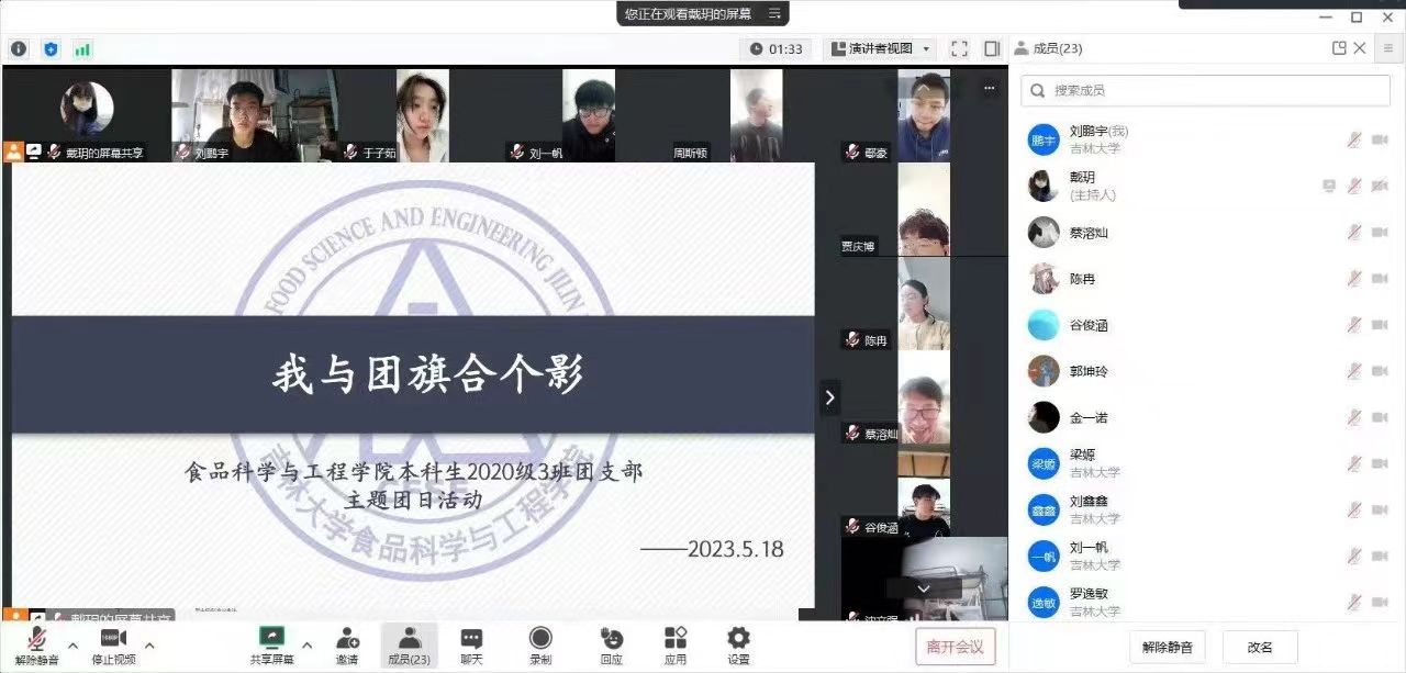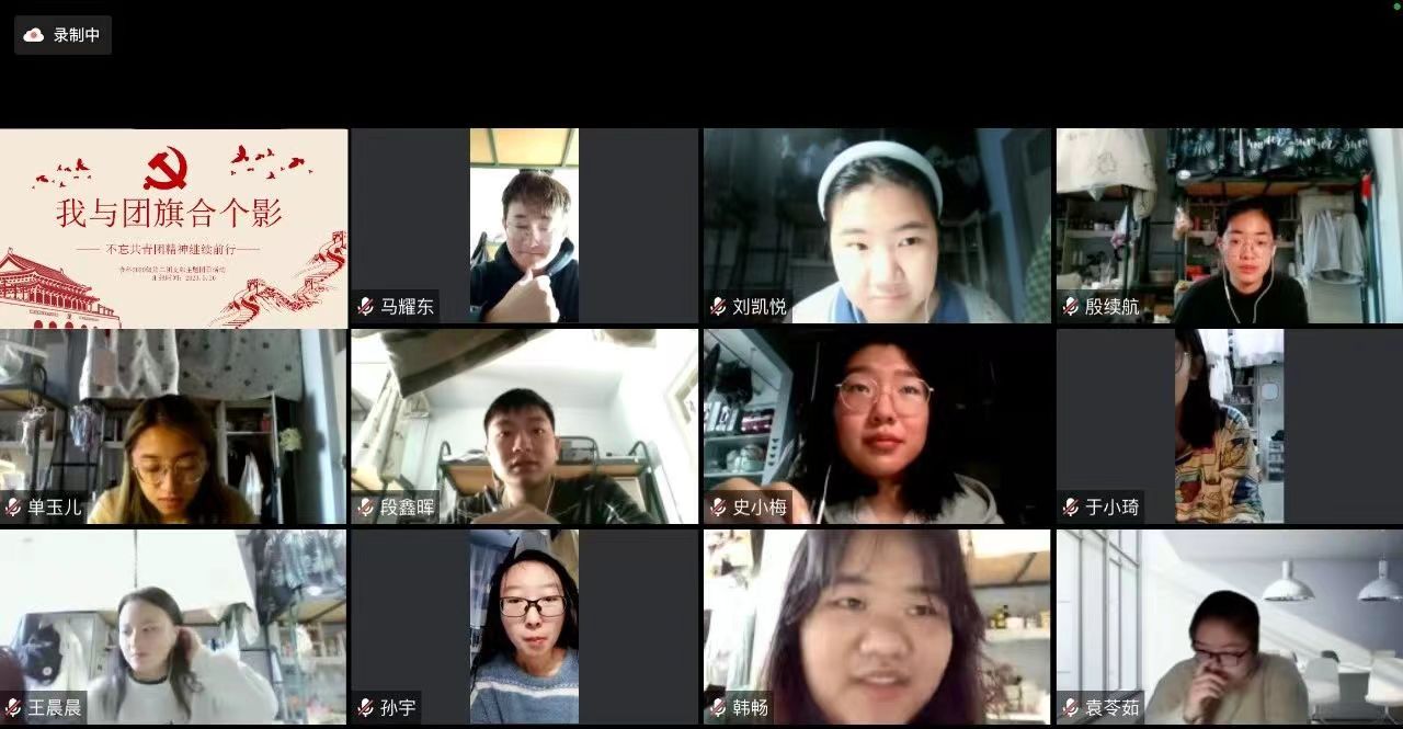 2023年5月18日,2020级一班的同学们以线上形式开展活动。首先,由团支书简单介绍本次活动目的,旨在回忆入团宣誓时的慷慨激昂,回顾成为团员以来的心路历程。接着,同学们纷纷打开摄像头,记录自己与团旗合影留念。在飘飘团旗下,同学们不忘初心,始终坚定对团的思想认识,坚持以共产党员预备队伍高标准严格要求自己。最后,同学们先后分享自己的先进事迹,并表示当以优秀团员为标准,践行青春榜样力量。