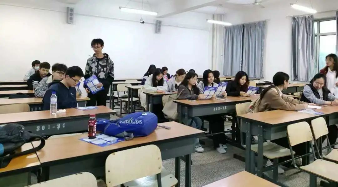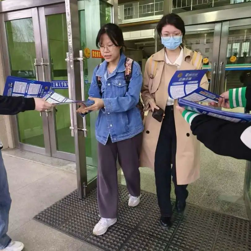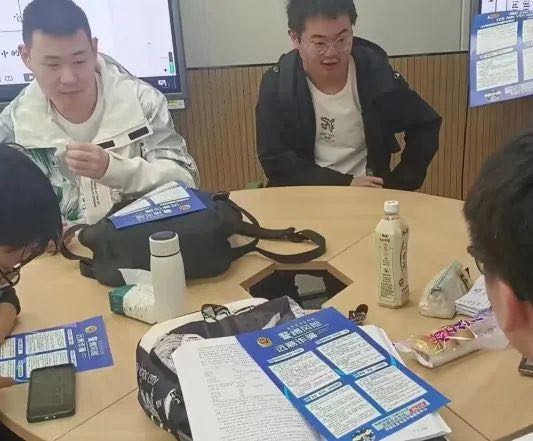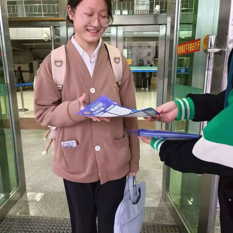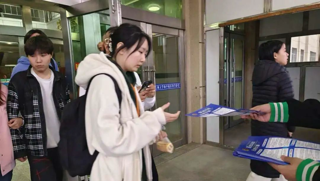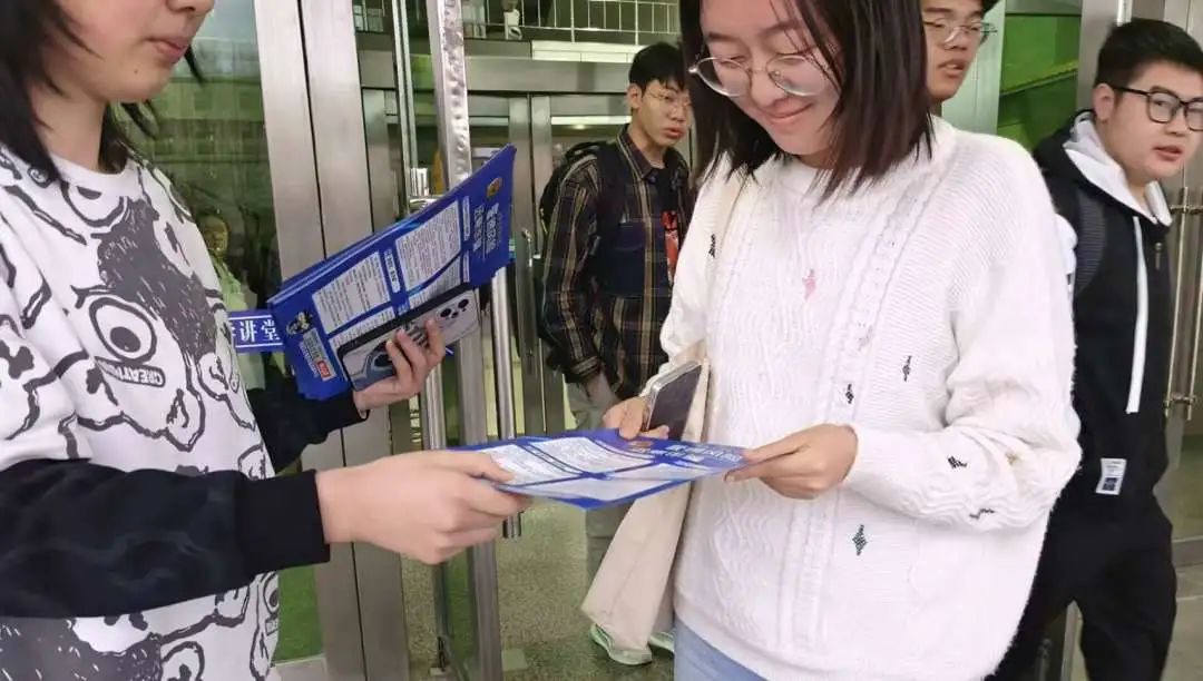 由王森、王文会和顾钰组成的反诈传单分发小队,在和平校区科学讲堂门口为路过的同学分发反诈宣传单,进一步提高反诈活动的影响力,引导同学增强自我防范意识,避免上当受骗。