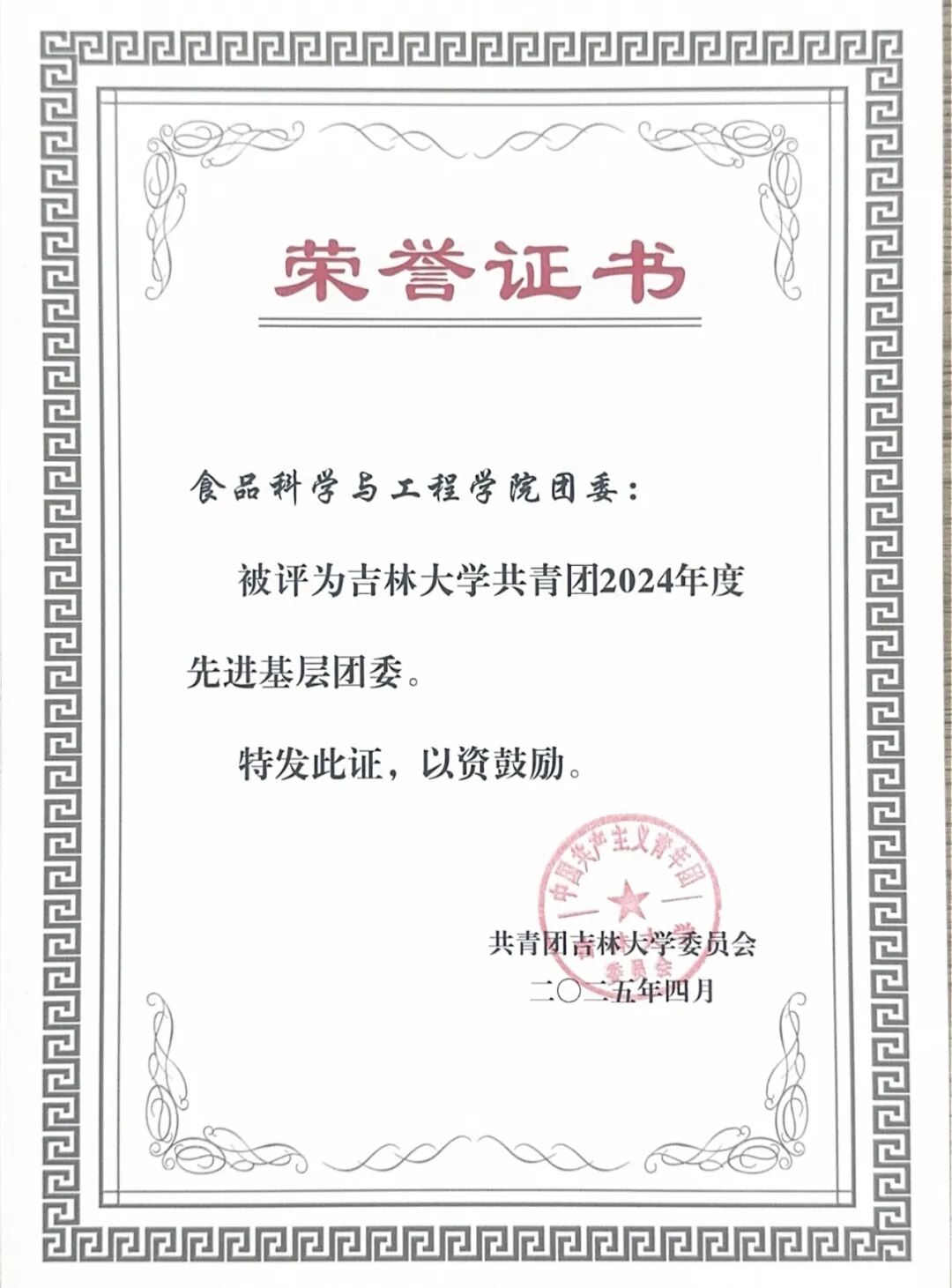 近日,在吉林大学共青团2024年度“创先争优”评选与吉林大学“十佳(优秀)学生会”评选工作中,我院团委荣获吉林大学共青团2024年度“先进基层团委”荣誉称号。