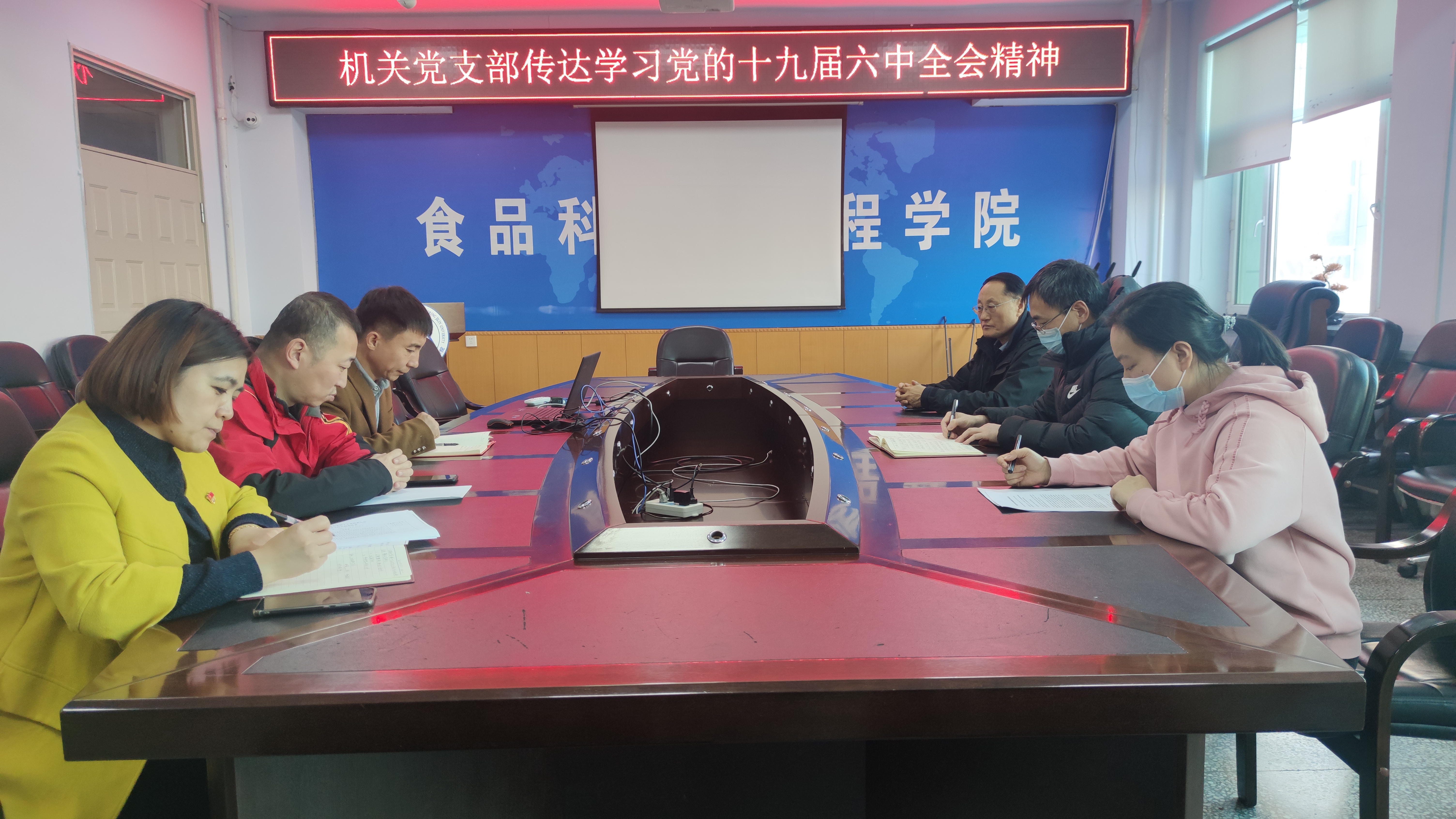 为深入学习十九届六中全会精神,加强机关党支部建设,2021年11月24日下午,beat365中国唯一官网机关党支部在食品楼三楼会议室组织开展了专题学习暨主题党日活动,专题学习中国共产党第十九届中央委员会第六次全体会议公报。本次会议由学院机关党支部书记马爽主持。