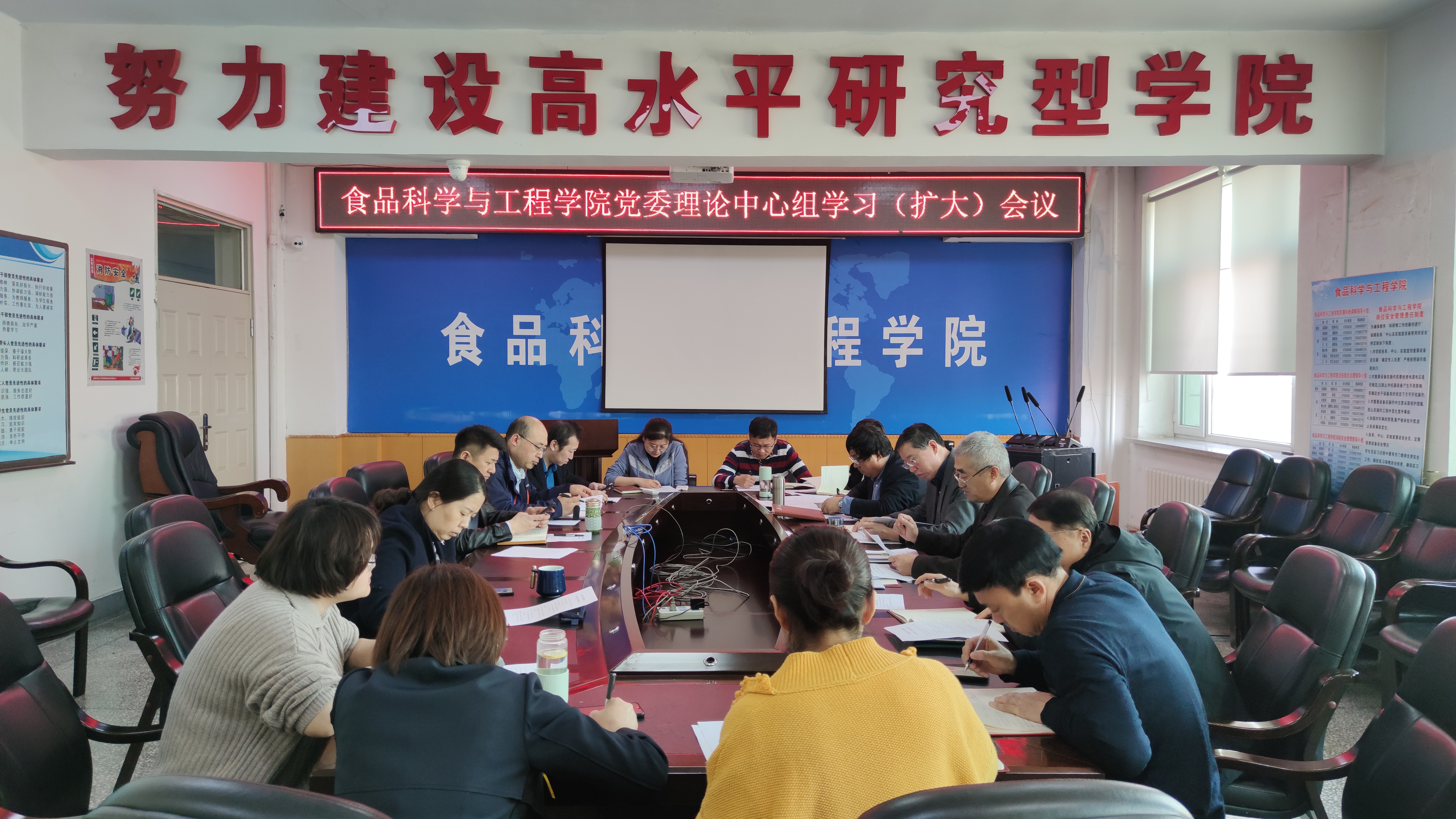 根据学校《关于学习贯彻2021年学校工作会议暨第八届教职工代表大会第四次会议精神的通知》要求,2021年3月31日下午14时,beat365中国唯一官网在食品楼三楼会议室召开党委理论中心组学习(扩大)会议。学院党政领导班子成员、院学术委员会主任委员、院学位评定委员会主席、院教学委员会主任委员、各办公室、系(中心)、教研室主任参加了会议。会议由学院党委书记董怀智主持。